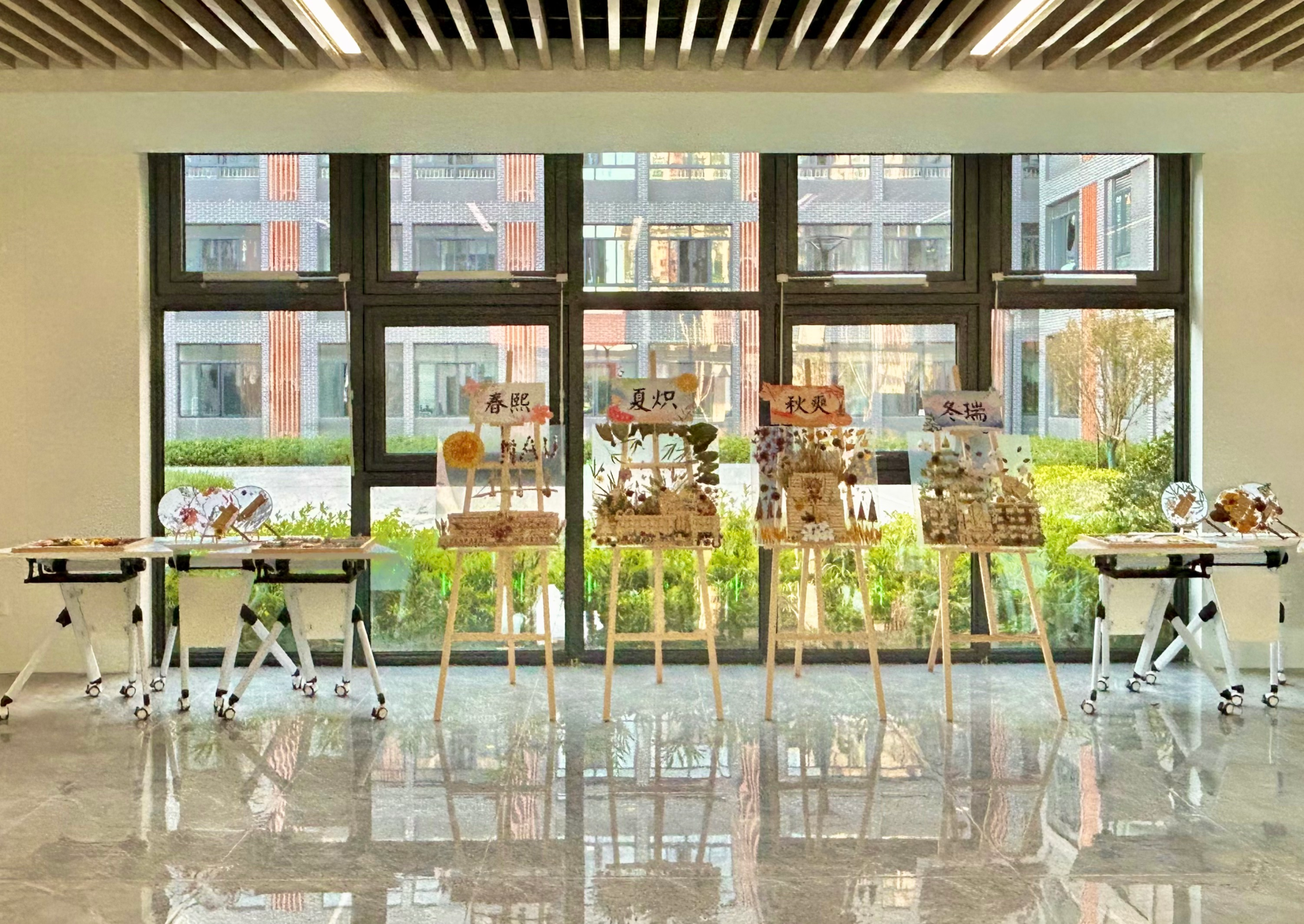 工业设计专业本科生党支部与车辆工程本科生党支部利用工科专业优势,运用绘图、建模等软件,利用电钻、螺钉等工具,从创意构思到底稿设计,从模型切割到立体拼装,通过精准建模、精细切割、精巧组装完成“工艺”设计。风景园林专业本科生党支部和园林设施专业本科生党支部以胶水为笔,用植物做媒,捡枝干画线,挥花瓣成面,将对南农美景的记忆寄托于植物的色彩和搭配上,让四季缤纷之韵跃然呈现在楼宇模型之间,“花艺”之美与“工艺”之精在此刻交融相汇。