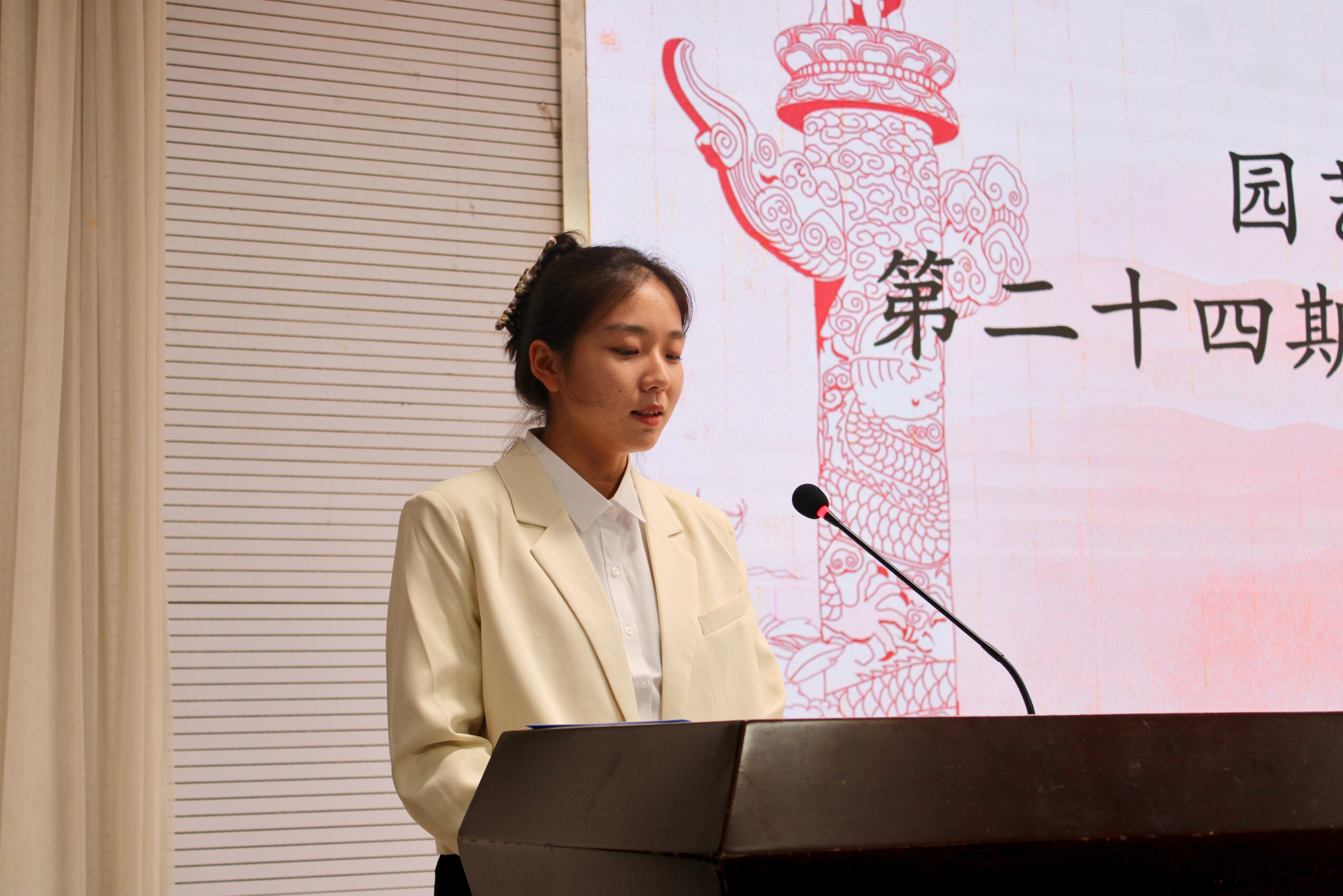 在园思讲堂环节,陈蕊为全体学员作《党旗所指心之所向——中国共产党党旗之路》专题讲座。她以《铁道游击队》为引,向同学们讲述了党旗的发展历程,指出了今日党旗并非建党之初就已确定,其形态的演变,与中国共产党由小到大、由弱到强的峥嵘奋斗历史紧紧相连,旗帜引领前进方向,旗帜凝聚奋斗力量。她寄语同学们记住“党旗所向,心之所向”,不忘初心、牢记使命,坚定理想信念,为实现中华民族伟大复兴的中国梦奉献青春力量。