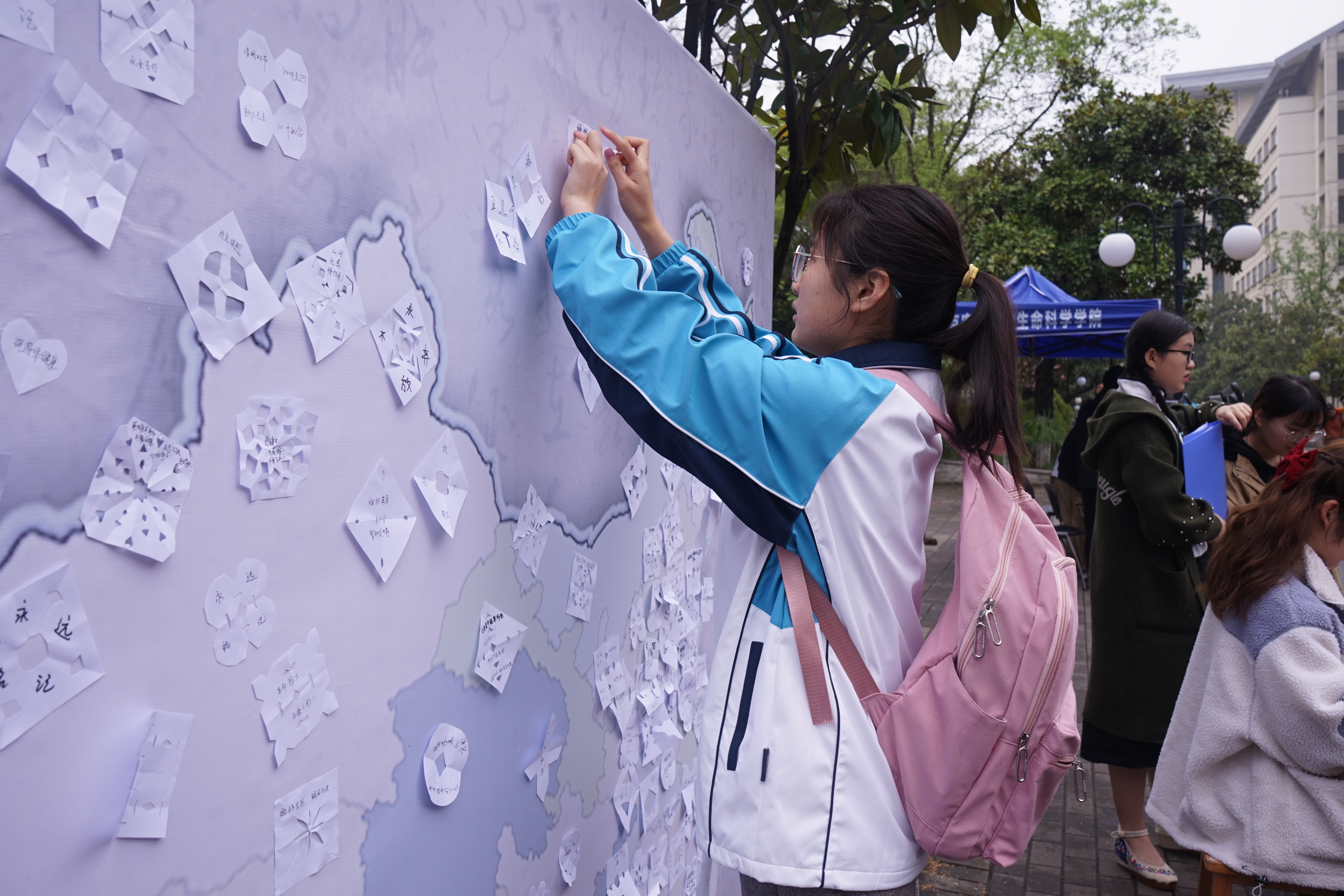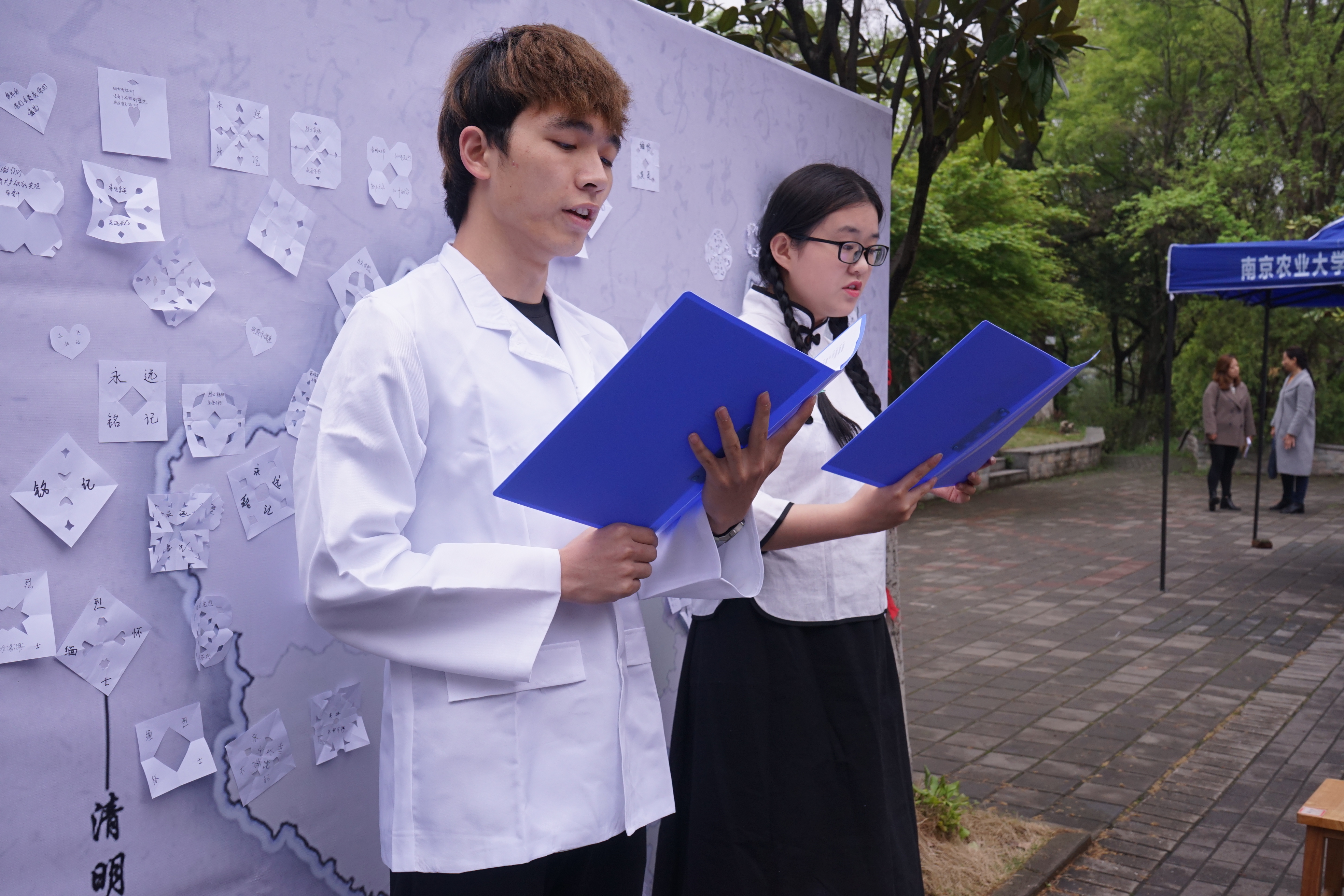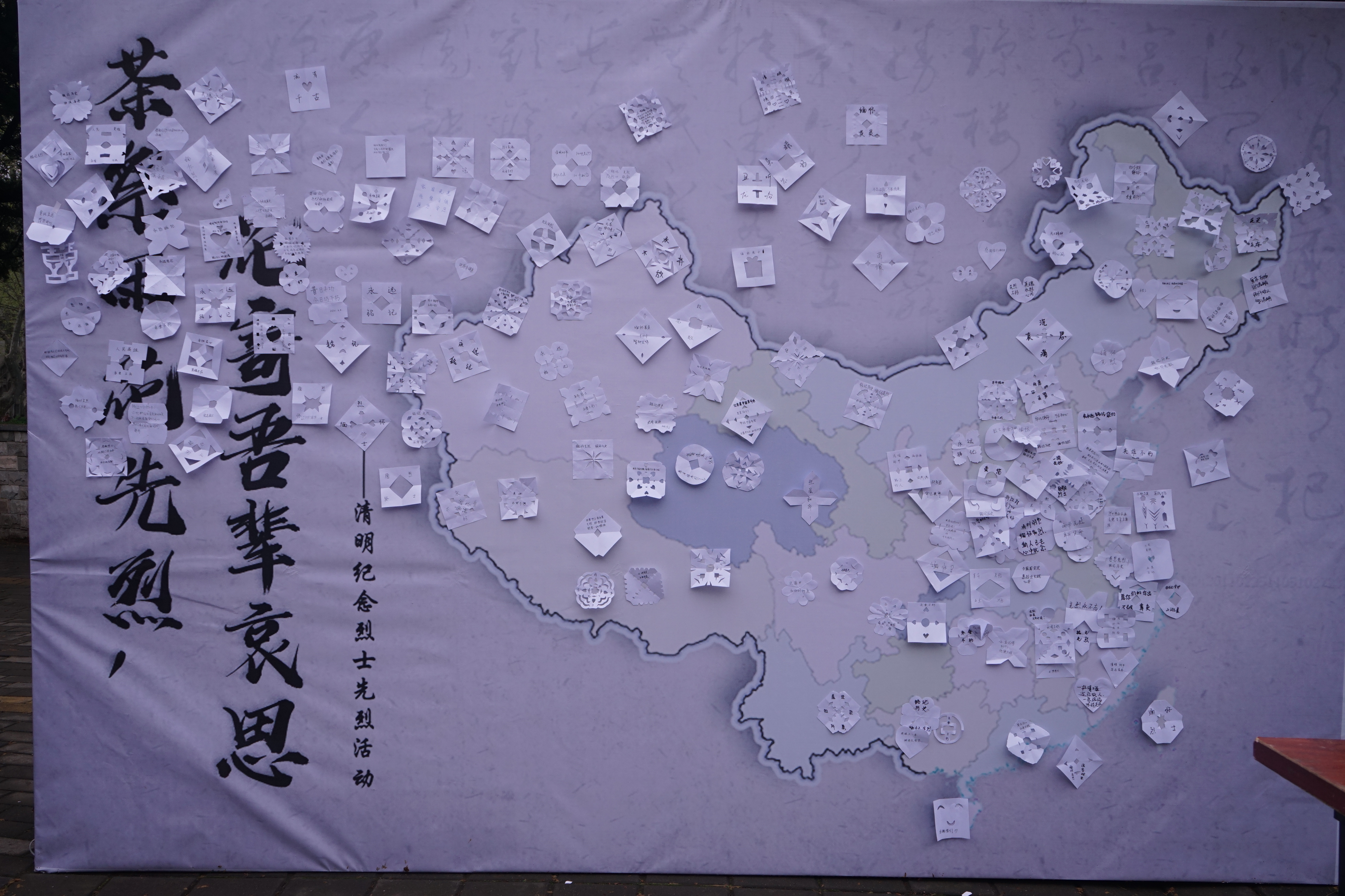雨花茶因产于南京,状如松针,象征雨花台牺牲的革命烈士的铮铮铁骨,又能寓意英烈精神万古长青而得名,与安化松针、恩施玉露一起,被称为“中国三针”。来自南农茶艺协会的同学们为缅怀革命先烈,在茶艺表演的现场还准备了一面以中国地图为主版的海报,过往的同学们在品雨花茶的独有香味、听雨花茶过往的故事的同时,还可以将自己亲手制作的一朵朵凭吊白花贴在祖国的各个位置,献上一份给自己家乡的革命烈士悼念,寄一份缅怀,念一声敬重。