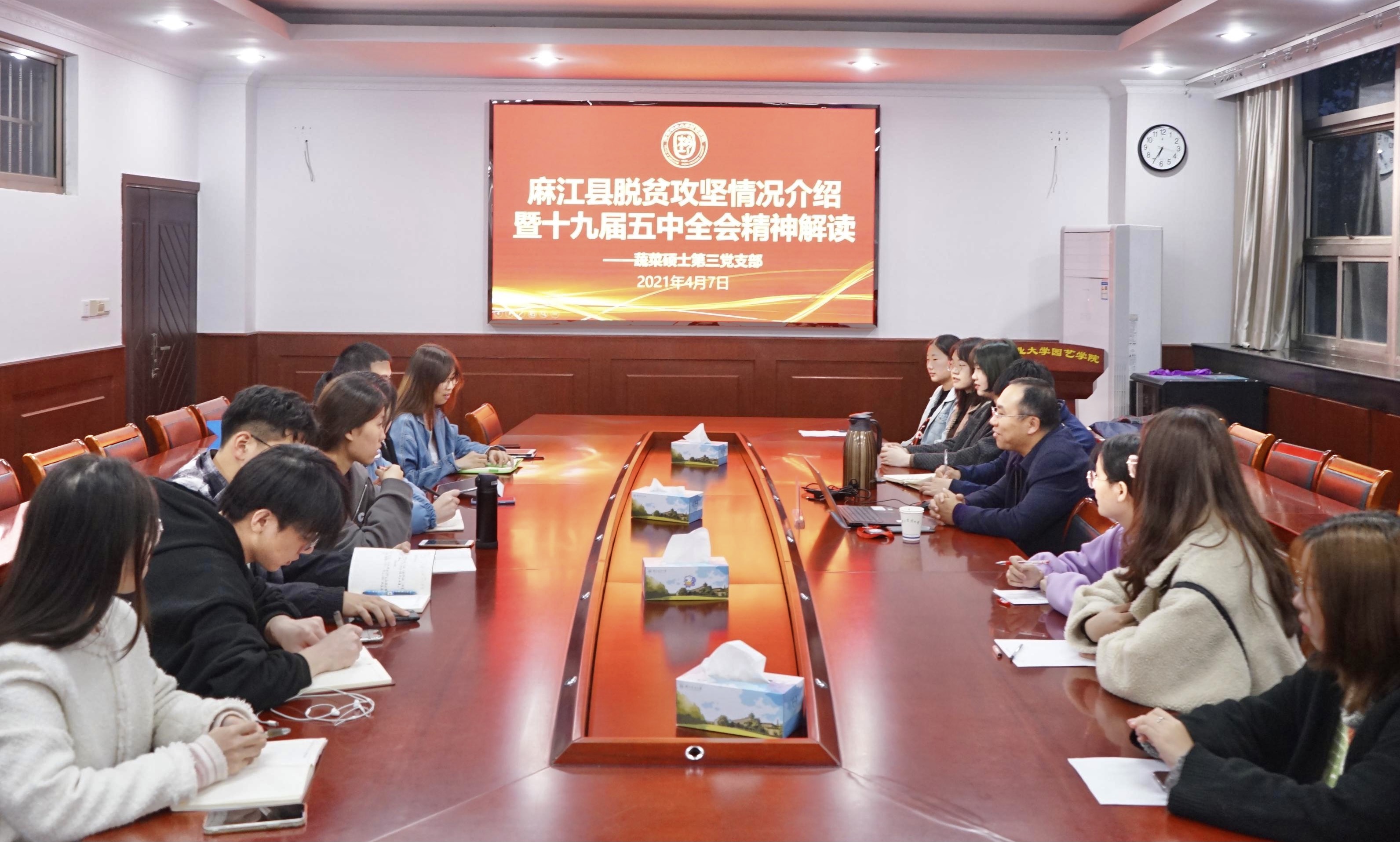 4月7日18:30,蔬菜硕士第三党支部在厚德厅召开支部会议,支部指导领导学校社会合作处副处长、新农村发展研究院办公室副主任、麻江县人民政府副县长李玉清出席会议,会议由支部书记褚阳阳主持。