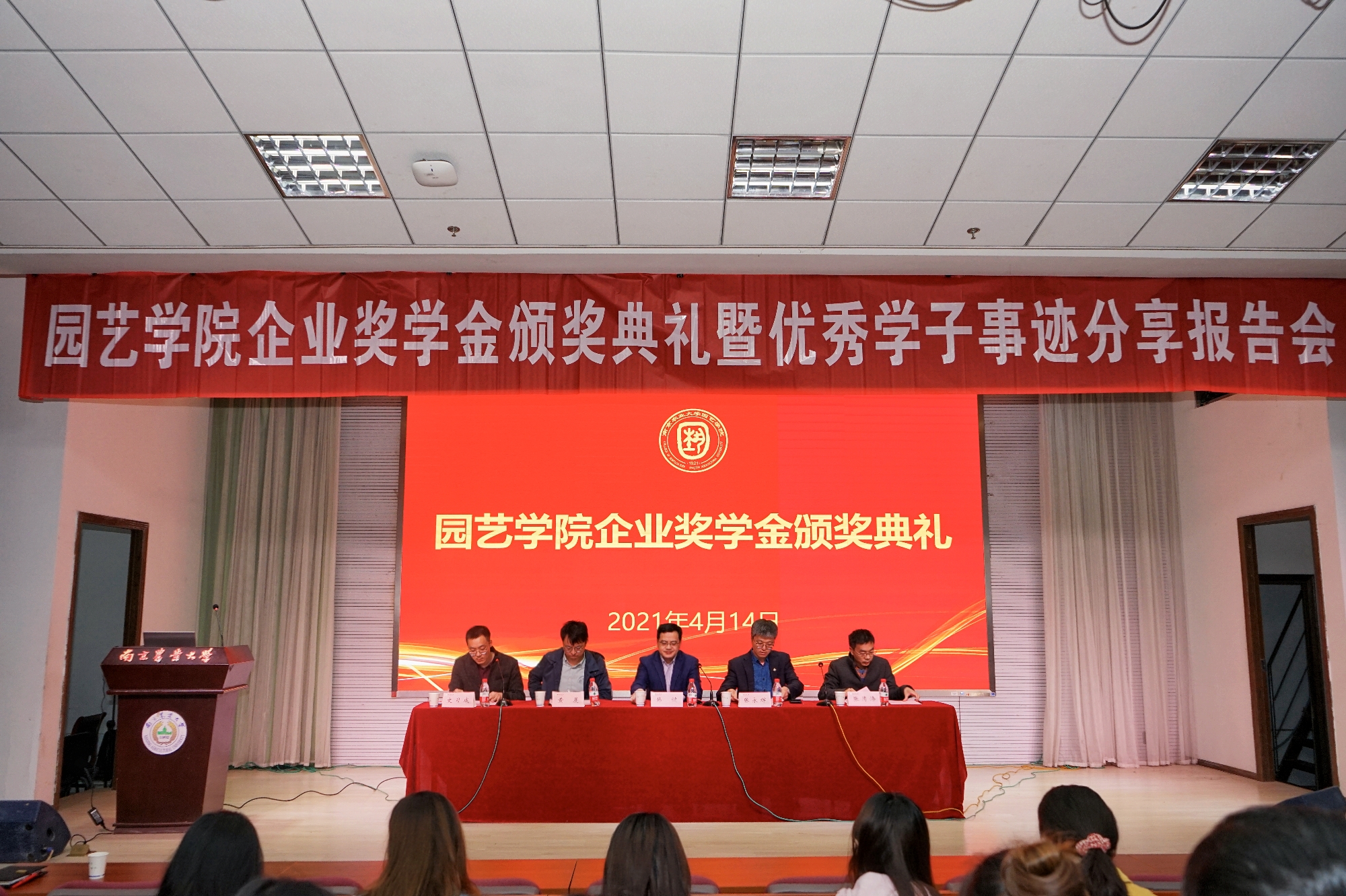 企业奖学金颁奖典礼暨优秀学子事迹分享报告会在教四楼报告厅举行,金埔园林股份有限公司副总经理、学院01级校友张永辉,棕榈生态城镇发展有限公司南京总监部总监、学院04级校友黄晨,学院党委书记韩键、副院长张清海出席典礼,典礼由学院党委副书记文习成主持。