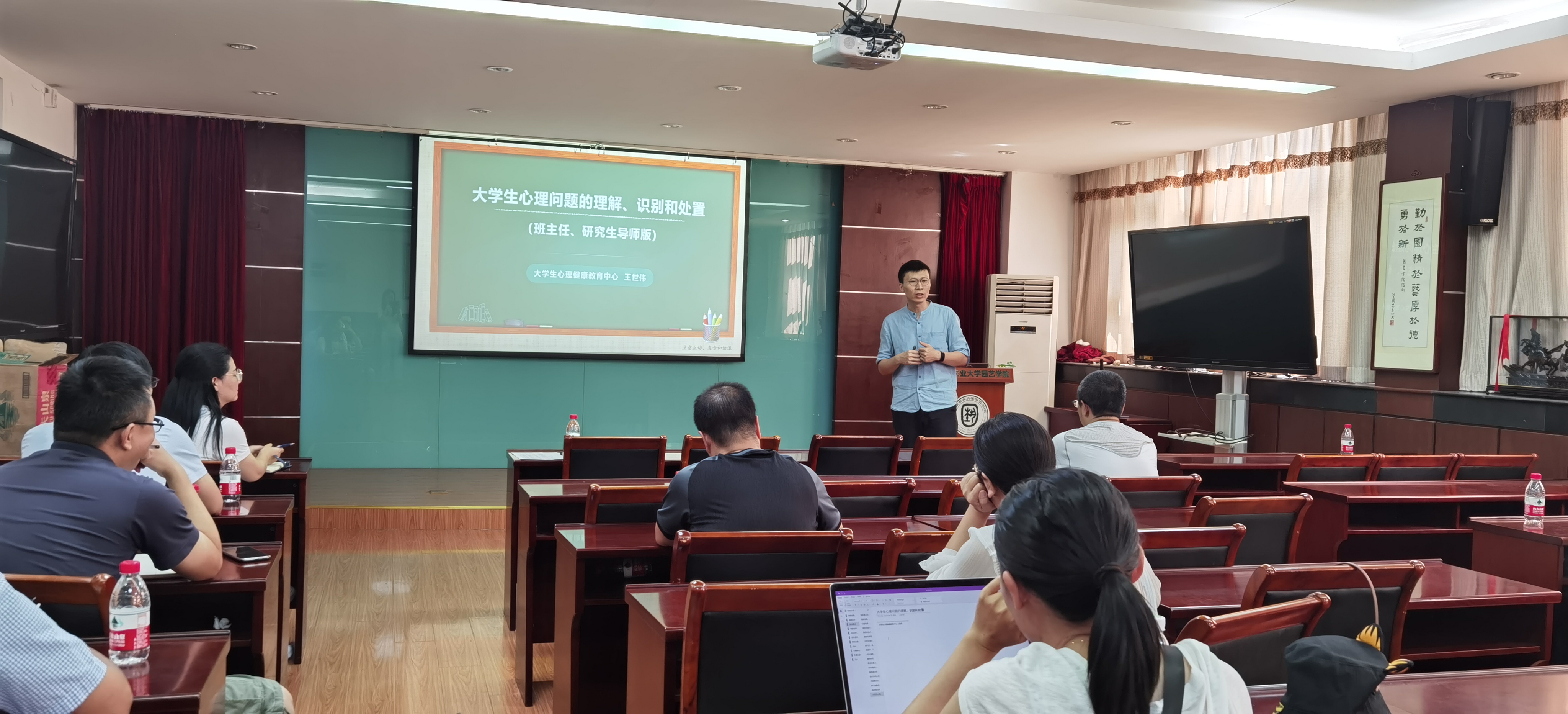 于2021年9月23日下午在生科楼B4010举办“大学生心理问题的理解、识别和处置”的主题培训讲座,学工处心理中心主任王世伟受邀开讲。学院部分本科生班主任和研究生导师参加讲座,讲座由辅导员鲁月主持。