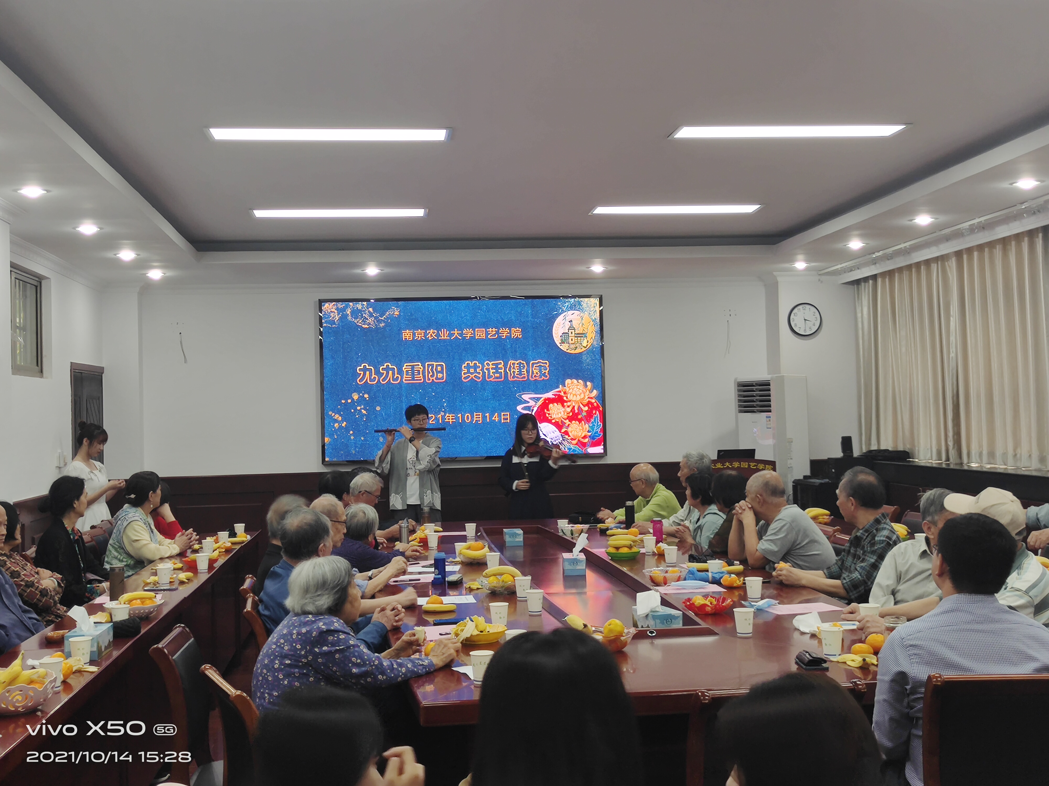 “九九重阳共话健康”是我党委举办的重阳节经典活动,自2013年开始,至今已经连续举办九年,每一年都是以“健康”为主题,围绕学院园艺、园林、中药、茶学、风景园林等专业与退休教师话健康,学生歌舞送祝福等形式,学院领导与退休教师其乐融融共度佳节。