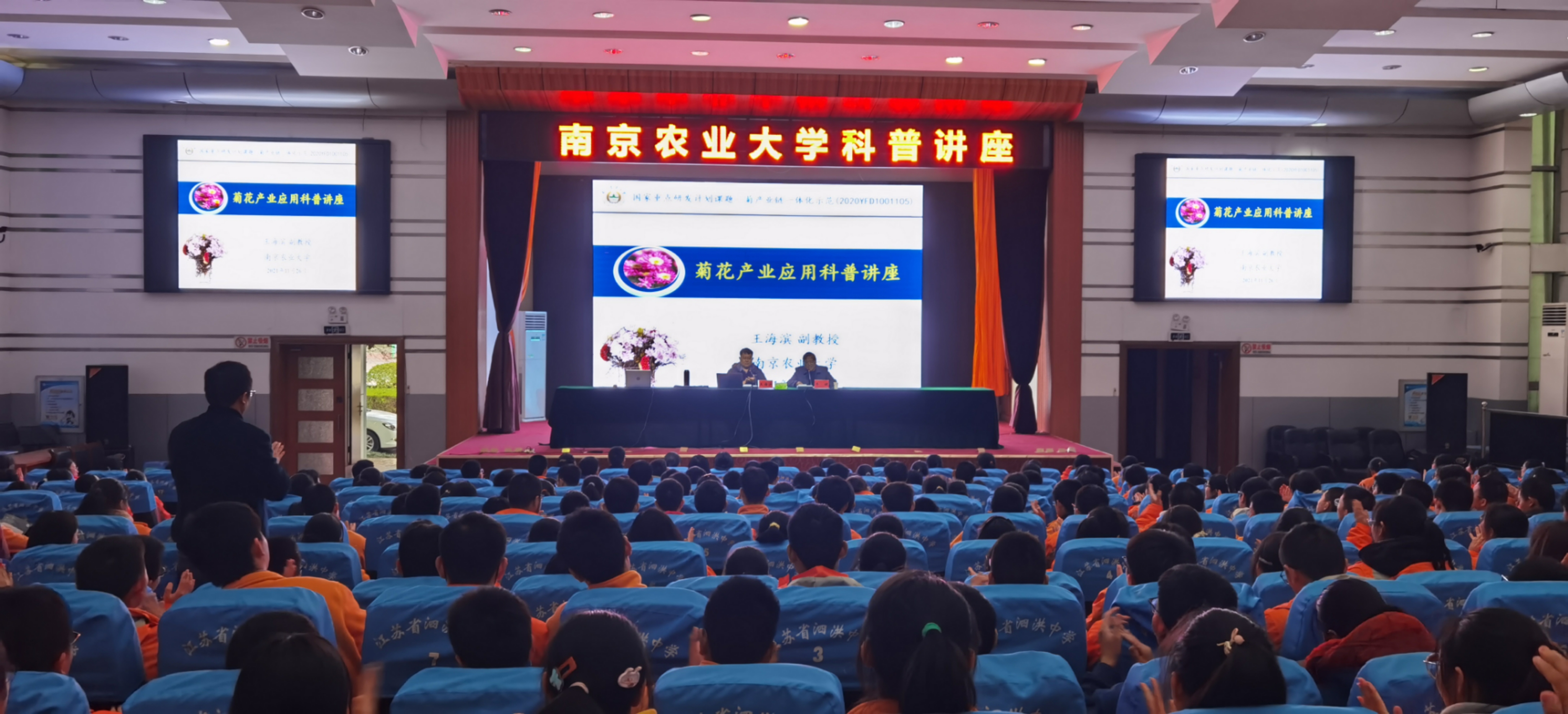 在泗洪中学,王海滨为700余名学生作了题为《菊花产业应用科普》的知识讲座。王老师从“采菊东篱下,悠然见南山”的菊花文化开始,讲述了菊花在花卉产业中的地位及观赏、药用、食用价值等,展示了各色菊花新品种,说到了日韩三级片