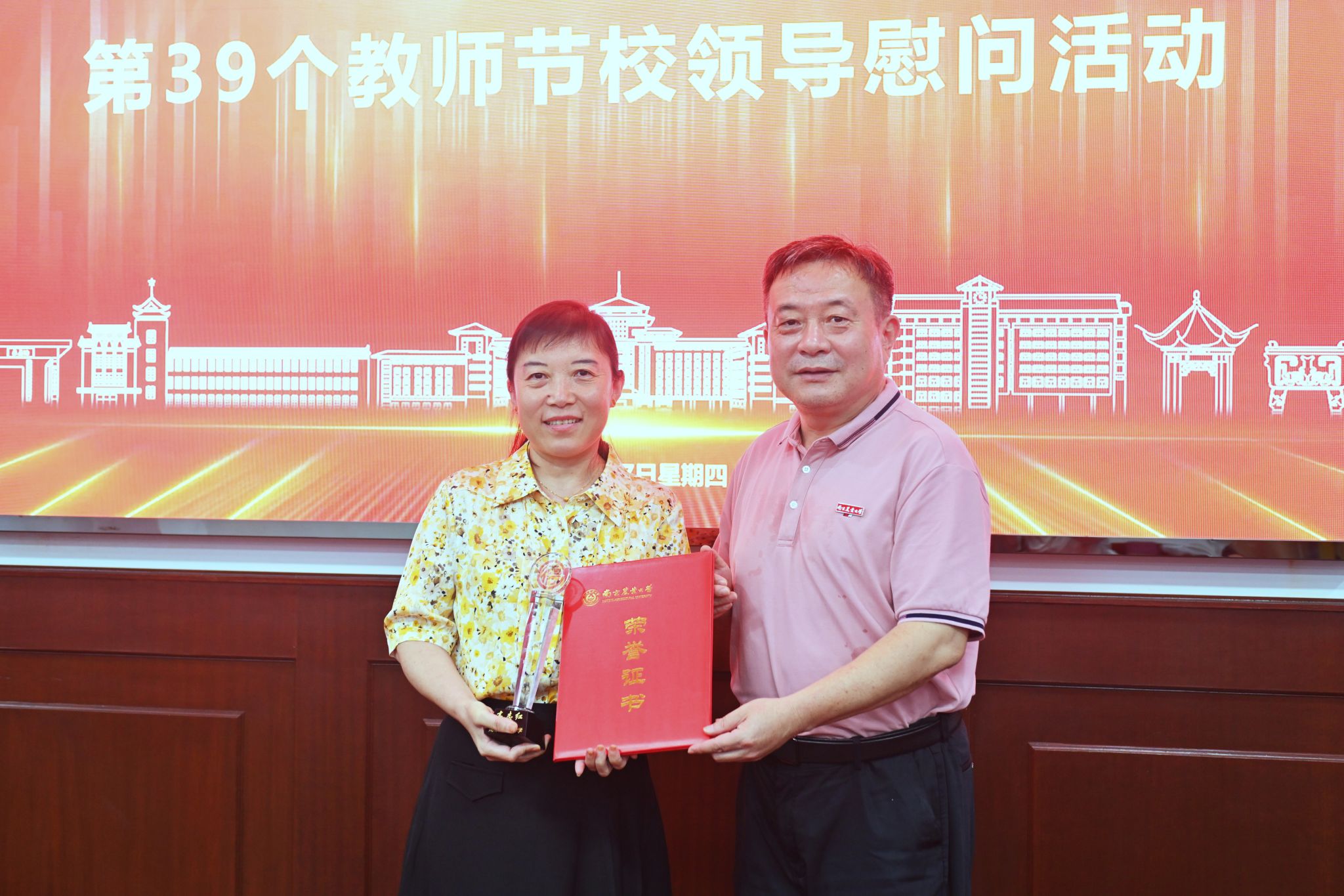 优秀教师高志红教授颁发荣誉证书,并代表学校感谢老师们在教书育人、科学研究、管理服务等方面为学校各项事业发展付出的辛勤努力和做出的重要贡献,肯定了他们在人才培养和科学研究等方面取得的优异成绩。他指出教师是人类灵魂的工程师,是太阳底下最光辉的职业,每位教师都是照亮南农的星辰,希望各位老师继续以立德树人为根本,以强农兴农为己任,不忘初心、牢记使命,为学校各项事业的发展作出新的更大的贡献,不断助力学校各项事业高质量发展。