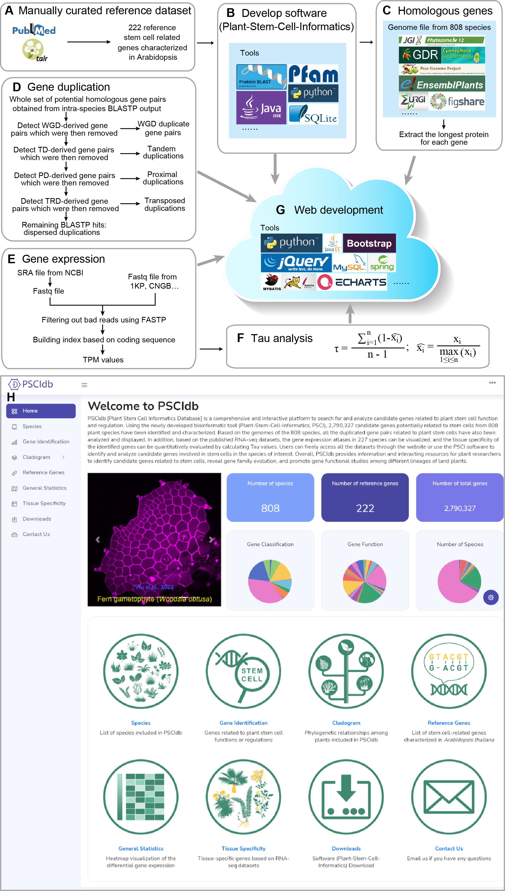 该研究利用自主研发的Plant-Stem-Cell-Informatics软件,在808个植物物种中鉴定干细胞通路相关的2,790,327个候选基因。同时提供了这些物种中与干细胞相关的重复基因对和227个物种基因表达谱等信息。最后,作者整合这些信息开发成数据库。整个数据库提供了主页