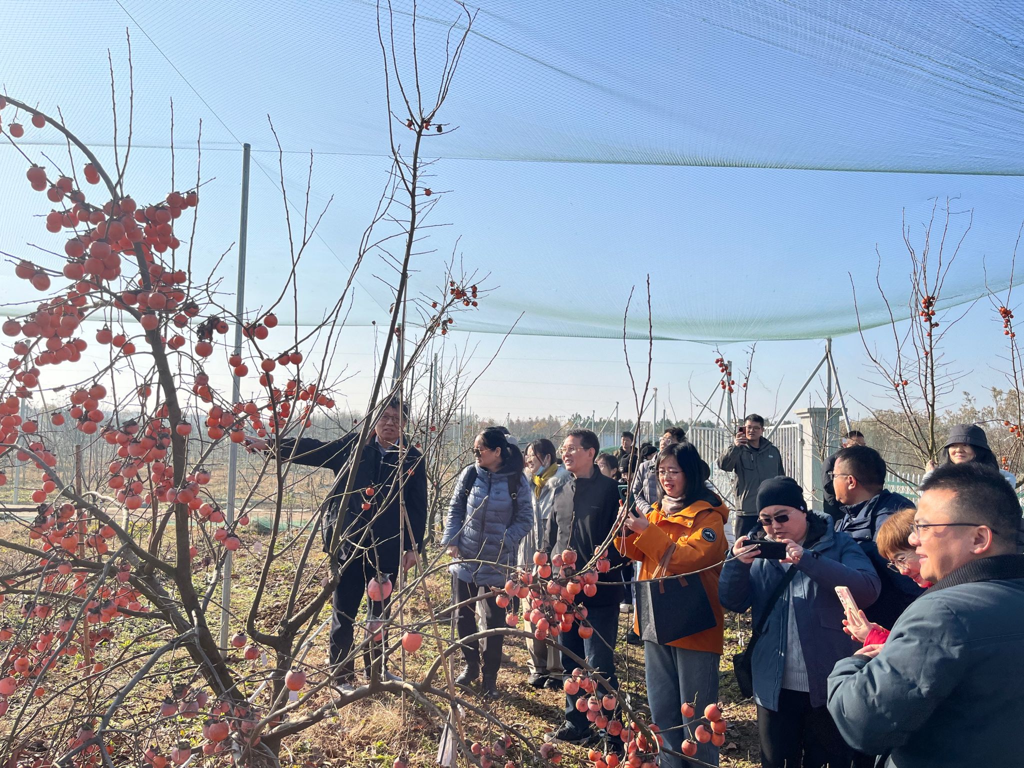 初冬的白马教学科研基地暖阳迎客,柿科研种质圃内,保种树上金灿灿的甜柿仍旧沉甸甸的缀满枝头,一眼望去仍能让人看出秋季的一派丰收景象。在这里,渠慎春教授将育人思政元素融入果树修剪实践课,在传授专业修剪技术的同时,让党员们领悟到“一元领导”在管理服务工作中的重要性。