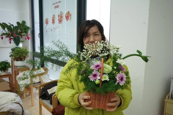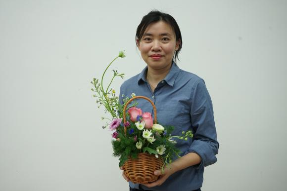 本次活动特邀陈素梅院长作插花技艺指导,她首先祝福学院全体女性教职工节日快乐,其后从插花技艺中比例与群组、色彩与焦点、均衡与动势三块内容展开讲解,由点及面向在场老师讲解插花中的审美与技巧,最后现场实操教学,一支又一支的花草素材在手中交叠错落,生机盎然又清爽养眼的组合在小小花篮中。