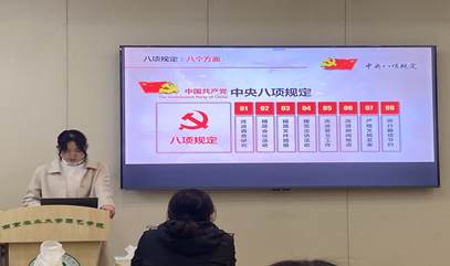 桑广玲同志带领大家学习中央八项规定精神及摘编内容,播放关于中央八项规定精神的解读视频,重点讲解八项规定的具体内容、出台背景及重要意义。并结合《中央八项规定精神摘编》进行详细解读。