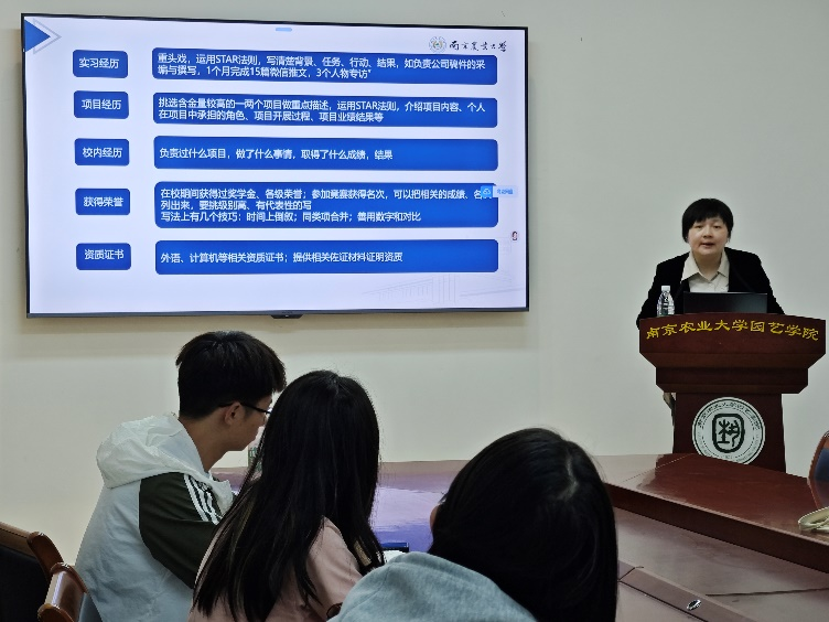 4月23日下午,学院在园艺楼148成功举办简历制作辅导讲座。此次讲座以小班化形式,旨在帮助学生提升就业竞争力,特别邀请到学校就业办雷玲老师担任主讲,吸引了部分研究生同学积极参与。