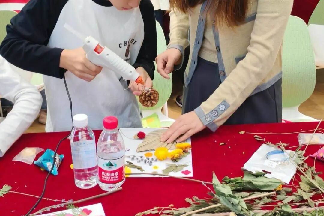 随后在青野手工社的耐心指导下,校友与孩子们一同发挥想象力,精心挑选、设计、粘贴,将一朵朵风干的花草定格在相框中。现场气氛温馨而专注,大手与小手的默契配合,不仅创作出了一幅幅独一无二的艺术作品,更编织了一段段难得的亲子协作回忆。