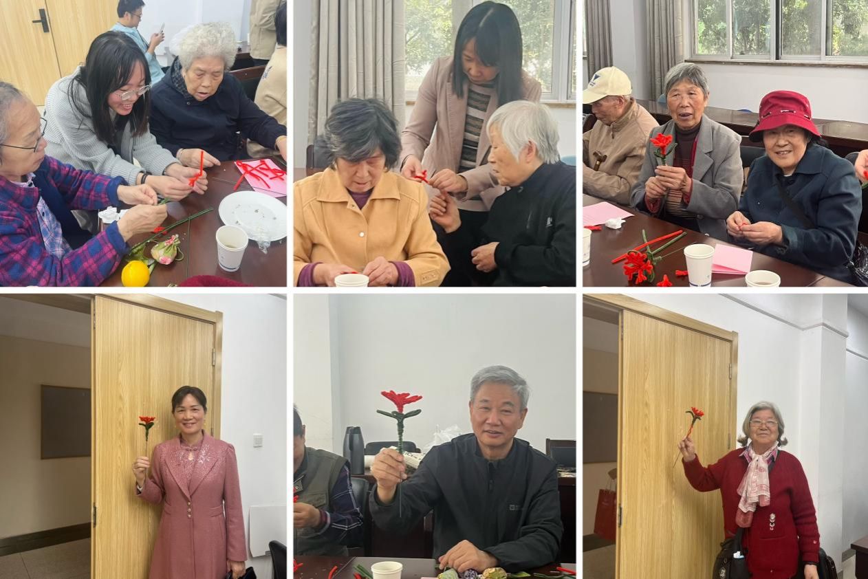 本次活动特别设置了手工体验环节。老教师们与学生一起制作了中药香囊和扭扭棒创意花束。老教师们兴致勃勃,与年轻学子们的互动更是为活动增添了无限的活力与温情。