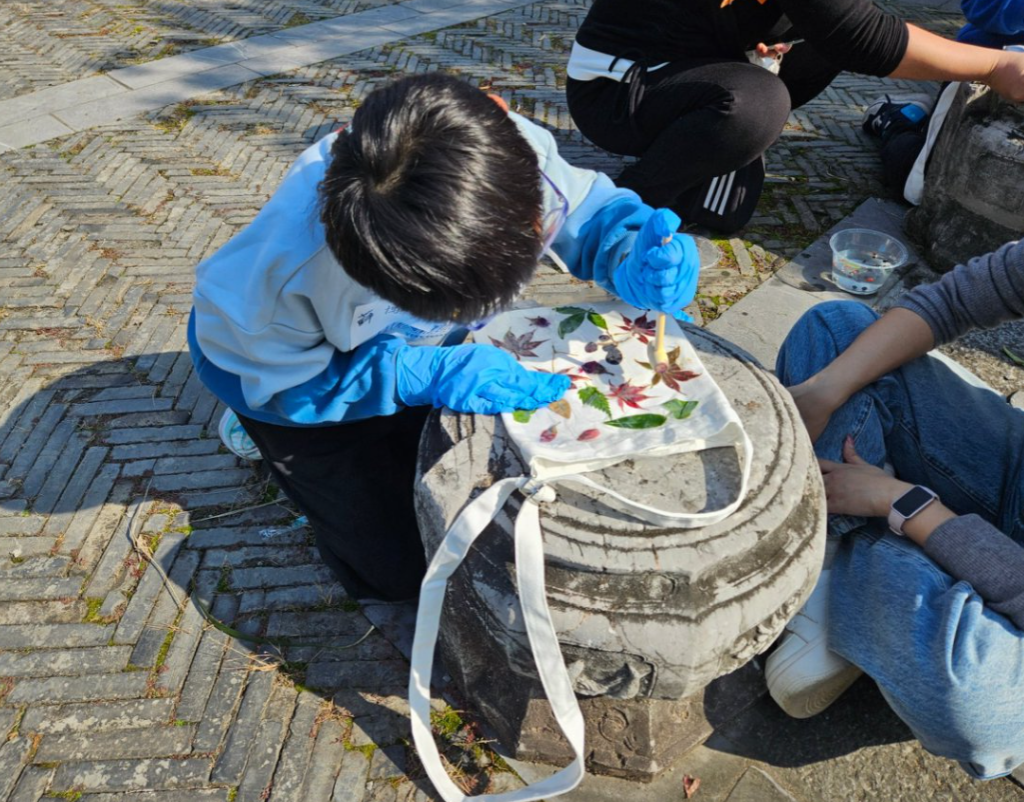此活动旨在引导孩子们亲近自然、了解自然,在沉浸式体验中唤醒观察力、激发探索欲。活动伊始,“松树与大树”互动游戏有效调动了团队气氛。随后,多点位的自然探索让小朋友们感受到自然的魅力,通过观察和体验各类植物的形状、颜色和质感,建立起与自然的亲密联系。沿途采集的落叶等素材被用于植物拓印,将自然的印记定格为独特的作品,让孩子们在创作中发现自然的细腻与美好。活动间隙,课程组学生还引导小朋友们通过触摸、嗅闻不同的果实,聆听环境中的风声、水声和鸟鸣以全方位调动五感。本次活动也充分体现了自然教育不仅是传授知识,更是让孩子在亲近自然中感受自然、爱上自然。