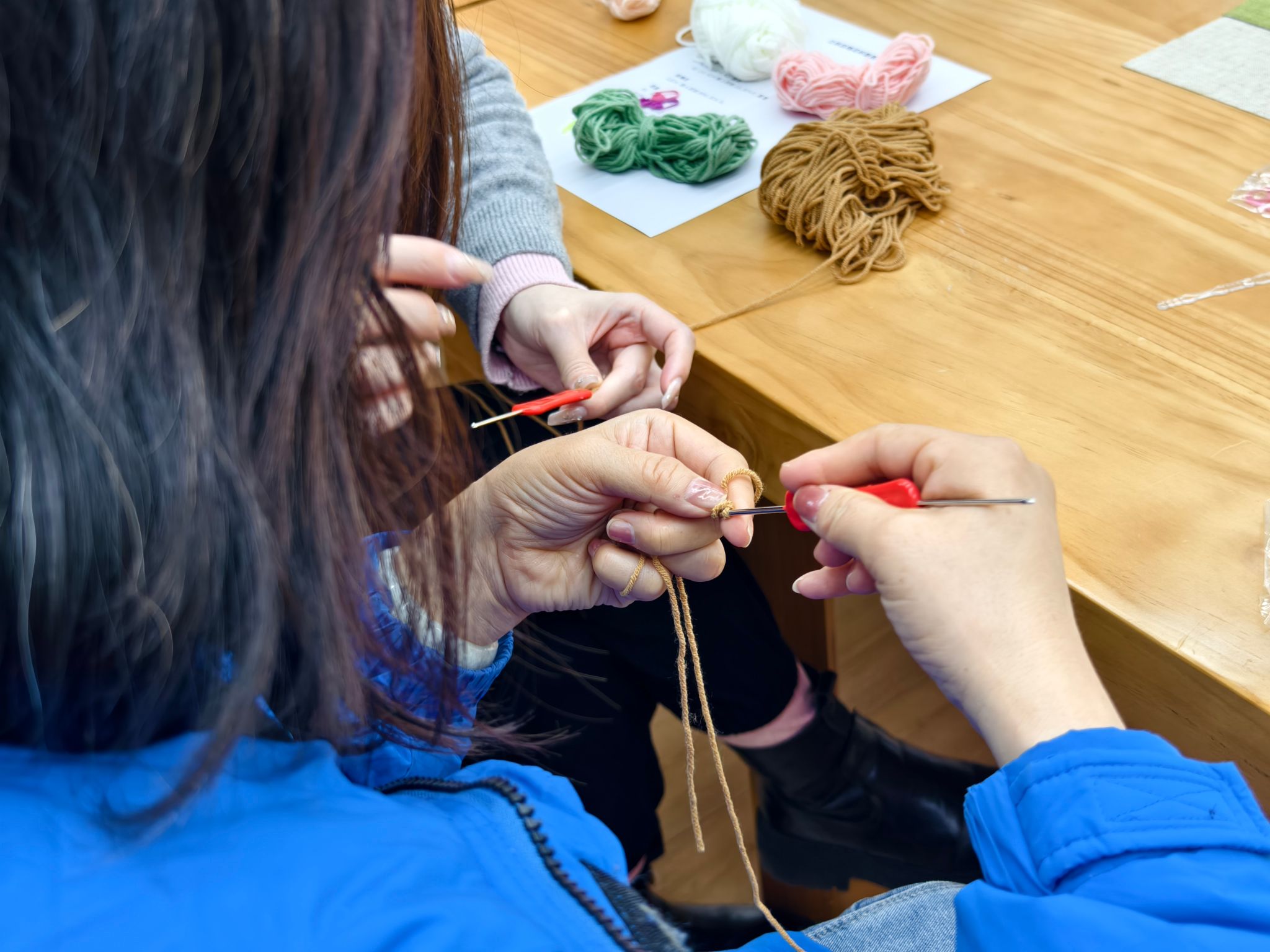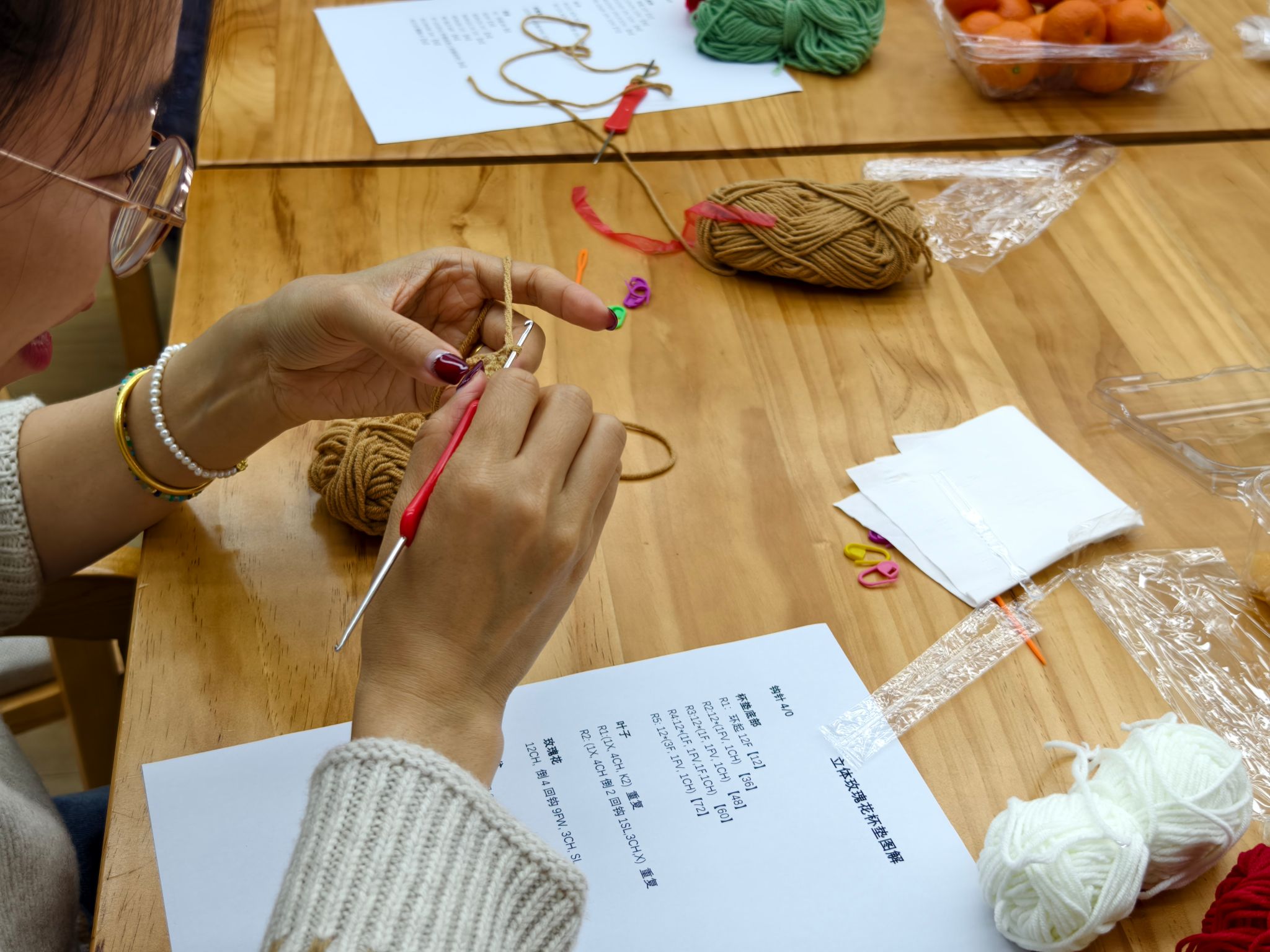 薛蕾老师作编织技艺讲授,薛老师从钩织起源、钩针型号、毛线材质特性讲起,逐步示范起针、锁针、短针等基础针法,手把手教学,针对老师们操作中遇到的难点问题,逐一进行指导,最终一朵朵活泼可爱的玫瑰花在老师们手中诞生。