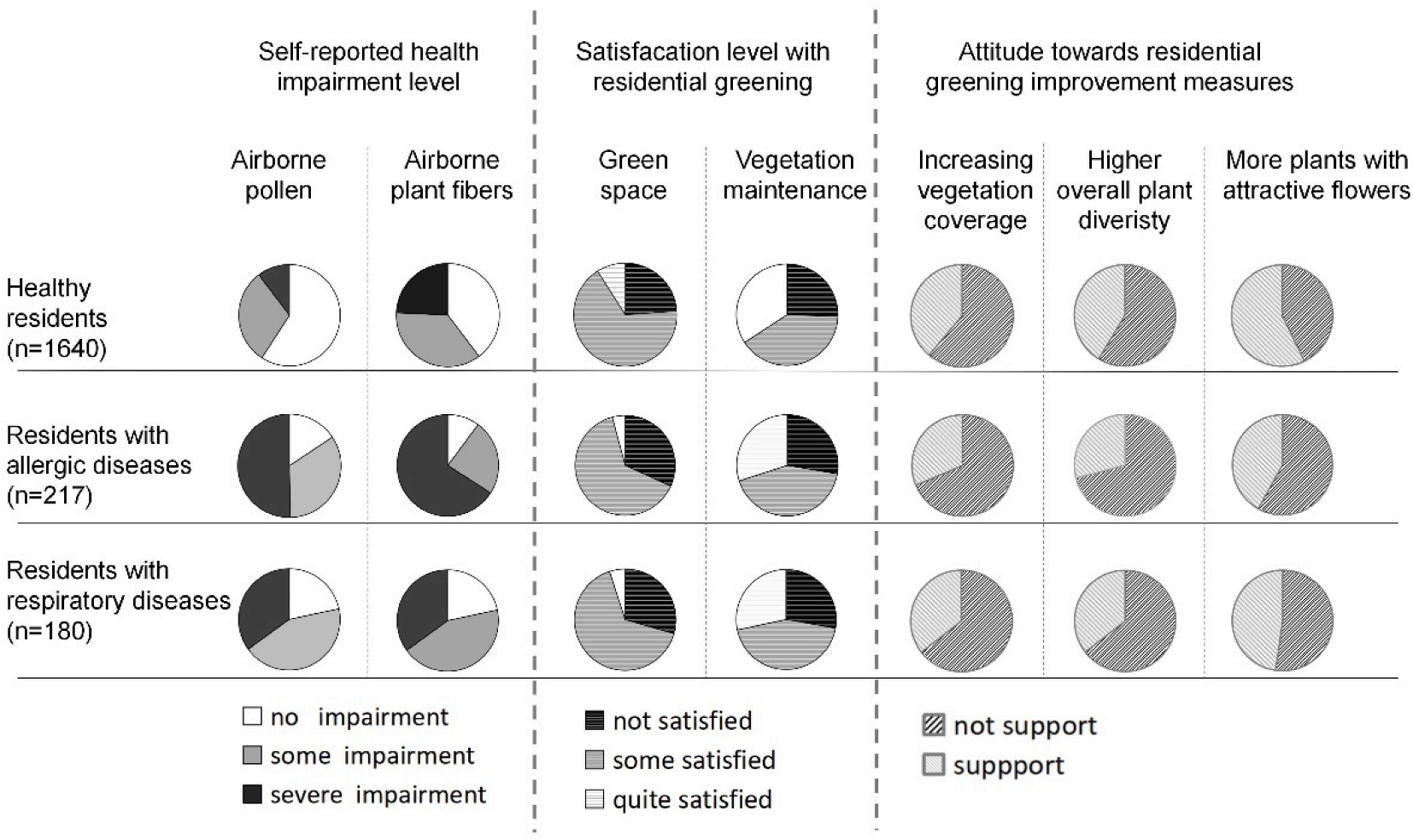 本研究在风景园林系2017级全体本科生的协助下,调查了南京市68个居住区内的植物组成情况;并通过问卷形式,询问了居民的呼吸道/过敏性疾病患病情况以及他们对居住区绿化的满意度和改进期待。研究结果表明,居民过敏性疾病汇报率与气传花粉类植物多样性正相关,但与植物总体多样性和植被覆盖率负相关;呼吸道疾病汇报率则与飘絮类植物多样性正相关。研究认为植物表现出的健康效应可能是其正/负两方面影响的净结果。研究还发现,尽管居民对植物健康效应的感知存在很大的模糊性,但总体而言,随着气传花粉植物与飘絮类植物多样性增加,居民对居住区绿化的评价与改进期望会下降。研究建议在城市绿化中景观设计师应与植物学、生态学、医学等多学科专家合作,以更好地为公众健康服务。