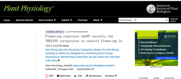 菊花遗传与种质创新团队的蒋甲福教授在国际知名期刊Plant Physiology发表了题为“Flowering Repressor CmSVP recruits the TOPLESS co-repressor to control flowering in chrysanthemum”的论文,揭示了菊花CmSVP招募CmTPL抑制CmFTL3的表达而调控菊花低温下的开花。