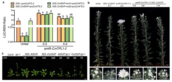 SHORT VEGETATIVE PHASE(SVP)属于Type Ⅱ型MCM1-AGAMOUS- DEFICIENS-SRF-box(MADS-box)基因家族成员,作为抑制活性转录因子,能够响应赤霉素路径、温敏路径和自主路径等多条开花路径而抑制开花,但SVP是如何抑制下游开花因子如FT基因的表达,并不清楚。本研究发现菊花中SVP的同源基因CmSVP通过结合FT的同源基因CmFTL3的启动子CArG元件来抑制其表达,从而参与菊花低温下开花延迟的调控;进一步发现CmSVP与菊花转录共抑制因子TOPLESS(TPL)CmTPL-2互作,且通过遗传学证明CmSVP-CmTPL1-2复合物是CmSVP作为成花抑制因子的先决条件。此外,研究发现CmSVP能够恢复拟南芥突变体svp-31的早花表型,AtSVP与AtTPL也能互作,且在拟南芥AtTPL显性负突变tpl-1中过表达AtSVP或CmSVP不能导致晚花,这说明SVP在菊花和拟南芥中抑制开花的功能保守(图1)。