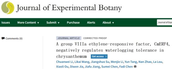 菊花遗传育种团队在权威杂志Journal of Experimental Botany在线发表了题为“A group VIIIa ethylene-responsive factor, CmERF4, negatively regulates waterlogging tolerance in chrysanthemum”的研究论文,揭示了菊花转录抑制因子CmERF4通过介导能量代谢和活性氧路径相关基因,负调控菊花耐涝性。