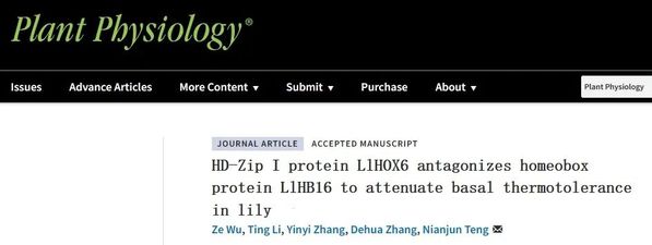 滕年军教授团队近年来在百合耐热性调控机制研究中取得了一系列研究进展,揭示了百合热激转录因子HSFA3通过高温诱导的可变剪接机制精细调控耐热性的机制(Wu et al., 2019, Plant Physiology; 与中国农业大学义鸣放教授合作完成);阐明了百合WRKY39以钙离子依赖的方式与CaM3互作精细调控桥接因子MBF1c的表达正向调控耐热性机制(Ding et al., 2021, Horticulture Research);发现了百合WRKY转录因子WRKY22直接作用于DREB2的上游参与耐热性的调控(Wu et al., 2022, Horticulture Research);在百合中鉴定了MYB305-C3H18-WRKY33功能模块调控耐热性(Wu et al., 2023, Molecular Horticulture);鉴定了一个膜结合的NAC转录因子LlNAC014,其响应高温转移至核内,激活DREB2-HSFA3模块正向调控耐热性(Wu et al., 2023, Journal of Experimental Botany);该篇论文进一步发现百合另一个HD-Zip I成员HOX6与HB16互作,拮抗地调控百合耐热性。基于上述系统的研究,该团队构建了比较完善的百合响应高温胁迫的分子调控网络,将为百合乃至其他农作物耐热性改良提供了重要理论基础。