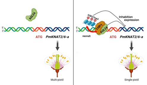 在多雌蕊梅品种中,PmAGL24在雌蕊数量分化初期表达水平较低,不与或少量与PmKNAT2/6-a基因的启动子结合,导致该基因的表达不受限制,形成多雌蕊梅的表型。在单雌蕊梅品种中,PmAGL24在雌蕊数量分化初期表达水平较高,能够通过结合PmKNAT2/6-a启动子的方式直接抑制其表达,也可以通过与PmLHP1形成蛋白复合体招募H3K27me3在PmKNAT2/6-a启动子上建立的方式间接抑制PmKNAT2/6-a基因的表达,从而形成单雌蕊梅的表型。该研究揭示了PmKNAT2/6-a需要不同类型的转录及调控机制共同发挥作用才可以确保雌蕊数量的正常分化,为进一步深入研究李属植物的多雌蕊现象提供理论基础,并对有效促进农业增效和农民增收、助力乡村振兴具有积极意义。