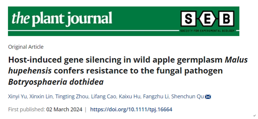 渠慎春教授团队在The Plant Journal期刊上发表了题为“Host-induced gene silencing in wild apple germplasmMalus hupehensis confers resistance to the fungal pathogenBotryosphaeria dothidea”的研究论文。该研究报道了野生苹果种质湖北海棠通过跨界传递miRNA诱导葡萄座腔菌基因沉默的轮纹病防御途径。