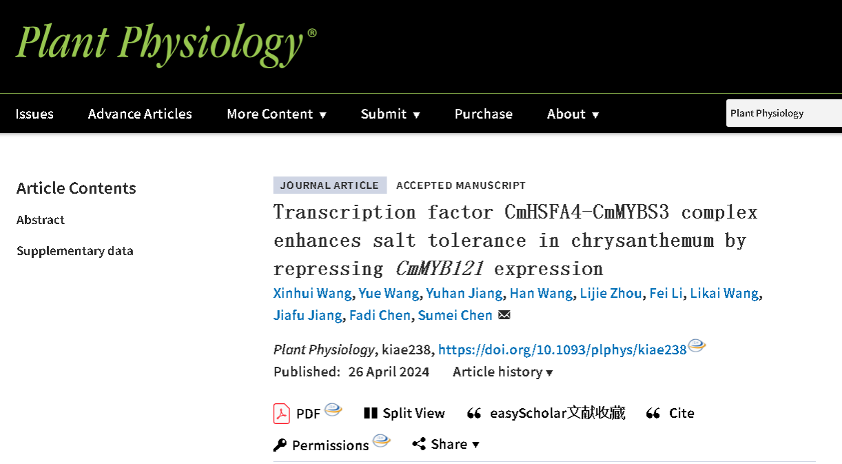 菊花遗传与种质创新团队在国际学术期刊Plant Physiology发表了题为“Transcription factor CmHSFA4-CmMYBS3 complex enhances salt tolerance in chrysanthemum by repressing CmMYB121expression”的研究论文,揭示了CmHSFA4-CmMYBS3-CmTPL蛋白复合体通过抑制下游靶基因CmMYB121启动子区乙酰化水平抑制该基因表达,进而正向调控菊花耐盐性的机制。