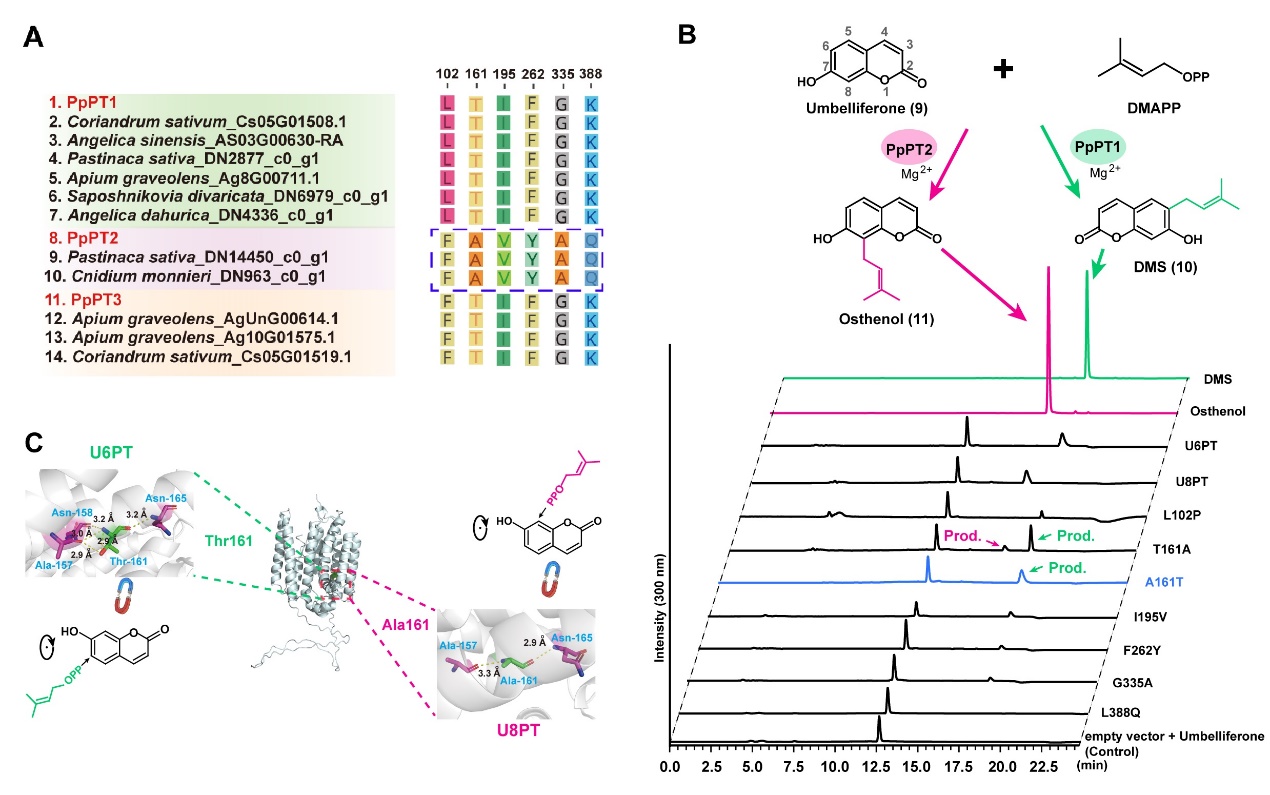 伞形科复杂香豆素的产物多样性主要源于C-PT的酶活功能变异,演化出针对于底物伞形酮(Umbelliferone)的不同位置(C-6/C-8)的催化活性。作者通过比较线性和角型构型复杂香豆素合成的C-PT蛋白序列,分析筛选出6个潜在的关键氨基酸位点(图2A),通过定点突变和酶活验证实验发现其中一个氨基酸的变异(Ala161/Thr161)会造成酶活性的改变,在合成线性和角型产物之间来回切换(图2B)。通过酶蛋白三维结构的分析,作者提出该位点通过改变该位置上氨基酸的疏水/亲水性,从而结合底物的不同位置(疏水/亲水面),最终造成产物的线性/角型构型差异(图2C)。