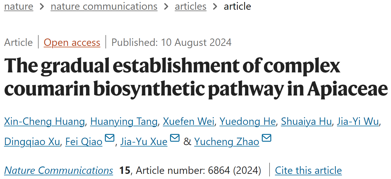 Yucheng Zhao, Yuedong He, Liangliang Han, Libo Zhang, Yuanzheng Xia, Fucheng Yin, Xiaobing Wang, Deqing Zhao, Sheng Xu, Fei Qiao*, Yibei Xiao*, Lingyi Kong*. 2024. Two types of coumarins-specific enzymes complete the last missing steps in pyran- and furanocoumarins biosynthesis. Acta Pharm Sin B. 14(2):869-880.