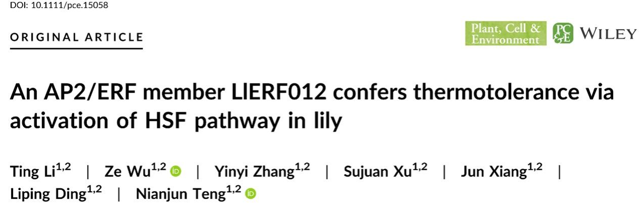 百合科研团队博士生李婷、吴泽副教授是Plant, Cell and Environment论文的共同第一作者,滕年军教授为通讯作者,团队成员钟山青年研究员徐素娟博士,博士生向均和丁利平,以及硕士生章茵艺参与了该研究。本研究得到了江苏省高校优势学科项目、江苏省种业振兴“JBGS”项目(JBGS[2021]093)、江苏省农作物种质资源保护项目(2021‐SJ‐011)和江苏省现代农业产业技术体系(JATS [2023]007)资金的支持。