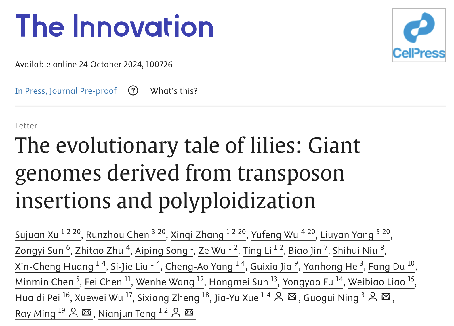滕年军教授团队、薛佳宇副教授团队,华中农业大学园艺林学学院宁国贵教授团队与福建农林大学明瑞光教授团队等国内10多家科研团队联合公布了百合高质量染色体级别基因组,成为世界上首个正式报道的最大植物基因组。日韩三级片相关的文章“The evolutionary tale of lilies: Giant genomes derived from transposon insertions and polyploidization”发表在《The Innovation》期刊。