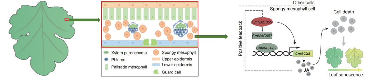 对菊花叶片衰老过程中不同类型细胞表达的基因进行分析,发现海绵组织细胞差异基因主要富集在JA等相关通路。外源茉莉酸甲基(MeJA)处理显著促进叶片衰老及各类型细胞死亡,其中海绵组织细胞的死亡加速更明显,导致其先于栅栏组织成为最早死亡的细胞。故推测JA选择性地诱导海绵组织细胞死亡,而其他类型细胞加速死亡是海绵组织细胞死亡的次生效应,可能受JA间接调控。进而聚焦到叶片衰老过程中海绵组织细胞特异被诱导表达的JA生物合成相关的基因CmAOS和CmACX5。借助单细胞核转录组及ATAC-seq联合分析,挖掘到关键转录因子CmNAC055及其直接调控的下游基因CmNAC087,通过分子、生化、遗传等实验明确其直接结合调控CmNAC087并进一步促进CmACX5表达,诱导JA在海绵组织细胞积累和细胞死亡,进而揭示了海绵组织细胞特异NAC055-NAC087-ACX5转录级联模块调控内源JA合成进而诱导细胞死亡。