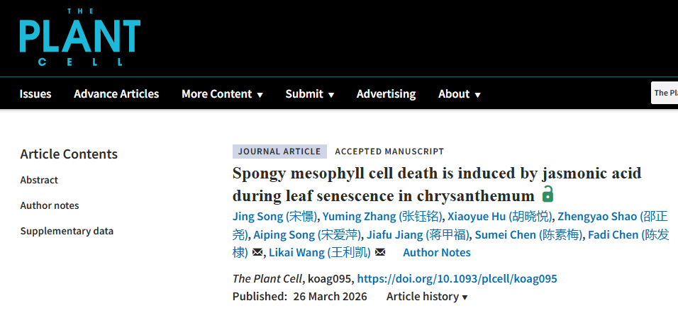 菊花遗传育种与种质创新团队在《The Plant Cell》期刊在线发表了题为“Spongy mesophyll cell death is induced by jasmonic acid during leaf senescence in chrysanthemum”的研究论文,揭示了叶片衰老过程中不同细胞死亡时序,发现海绵组织细胞特异NAC055-NAC087-ACX5转录级联模块调控内源茉莉酸(JA)合成进而诱导细胞死亡和叶片衰老的机制,助力精准保鲜技术创新;且发现这一机制在双子叶模式植物(拟南芥、番茄)和单子叶模式植物(水稻)中高度保守,丰富了植物叶片衰老调控网络。
